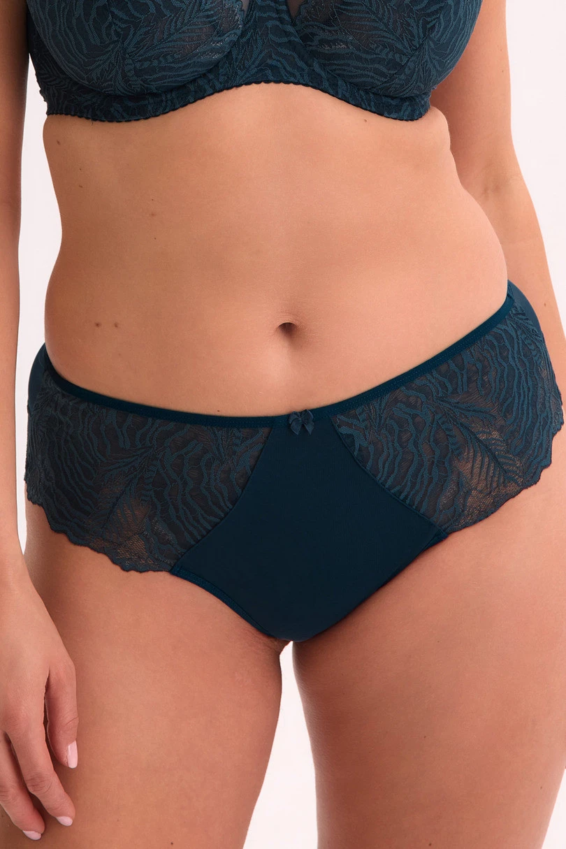 Brazilský spodní díl FB je jedinečnou kombinací elegance, smyslnosti a pohodlí. Tento model je vyroben z měkkého, k pokožce příjemného materiálu, který se přizpůsobí postavě a jemně ji zvýrazní. Boky a zadní část zdobí lehce průhledná krajka s květinovým vzorem, která dodává spodnímu dílu lehkost a jemnost. Přední část je vyrobena z hladkého materiálu, který zajišťuje pohodlí při celodenním nošení. Brazilský horní díl opticky prodlužuje nohy a krásně odhaluje hýždě. Ideální jako komplet s podprsenkou Jessia.