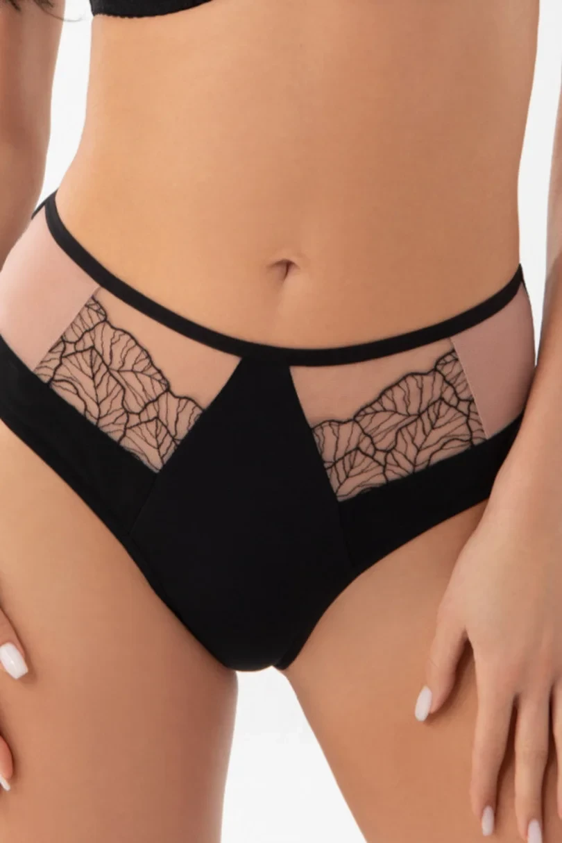 Jsou vyrobeny z mikrovlákna v kombinaci s elastickým tylem a výšivkou podšitou stabilním tylem. Zadní část je kombinací černého a průhledného tylu a vytváří efektní tvar. Zadní část z elastického tylu je hladce zakončena, takže kalhotky nejsou vidět pod oblečením. Bavlněný rozkrok.