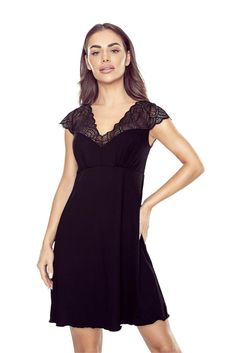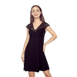 Noční košilka First Lady Britney je spojením elegance, ženskosti a výjimečného pohodlí. Je vyrobena z vysoce kvalitní viskózy, dokonale se přizpůsobuje siluetě a zajišťuje měkkost a vzdušnost po celou noc. Model se vyznačuje jemným, krajkovým lemováním ve výstřihu, na rukávech a na zádech, které celku dodává smyslný charakter. Působivý průstřih na zádech zdůrazňuje linii ramen a dodává košilce výjimečnou lehkost. Díky krátkým rukávům a jemně rozšířenému střihu košilka krásně přiléhá k tělu a zaručuje volnost pohybu. Je ideálním návrhem pro každodenní i výjimečné večery.