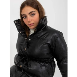 Černá zimní bunda z ekokůže s žebrovanými lemy .