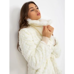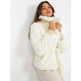Bílá zimní bunda s kožešinou a páskem na zavazování .