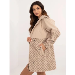 Dámská podšitá jarní bunda béžová, ve spodní části s potiskem. Zapínání na zip zakrytý klopou na cvoky. Odepínací kapuce.