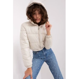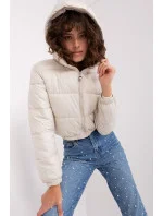 Dámská péřová krátká prošívaná bunda s dlouhými rukávy, zapínání na zip. Celopodšitá bunda s odepínací kapucí, kapsy na zip po stranách.