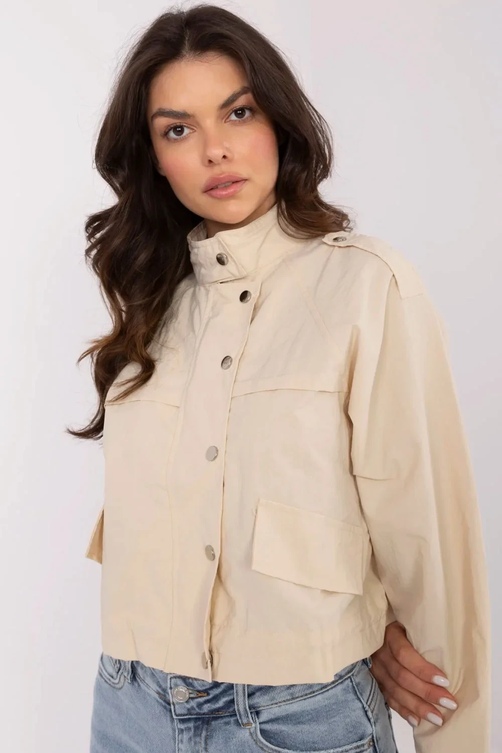 Lehká dámská větrovka je ideální volbou na jaro/léto. Vyrobená z odolného polyesteru skvěle chrání před větrem, zároveň poskytuje pohodlí a volnost pohybu. Hladký materiál jí dodává univerzální charakter a krátký střih skvěle ladí jak s džínami, tak se sukněmi. Větrovka má dlouhý rukáv a praktický zip, navíc zakrytý límcem na knoflíky pro lepší ochranu před chladem. Stylové náplety na ramenou jí dodávají charakter a imitace kapes zdůrazňuje minimalistický design. Skvělá volba pro ženy, které ocení ležérní styl a funkcionalitu.
