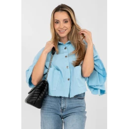 Elegantní dámská džínová bunda v casual stylu, ideální na jaro a léto. Vyrobená z vysoce kvalitní bavlny, poskytuje pohodlí při nošení každý den. Krátký střih krásně zdůrazňuje postavu, a spodek a rukávy s módním náznakem dodávají lehkost a charakter celku. Model se zapíná na knoflíky, vpředu má praktické nášitky kapsy. Rukávy 3/4 s volánem přinášejí jemný ženský akcent, který skvěle prolomuje klasický džínový styl. Bundu není vyztužená, díky čemuž se skvěle hodí na teplejší dny. Univerzální návrh pro každodenní stylizace, ideální jak k šatům, tak k džínám nebo sukním.