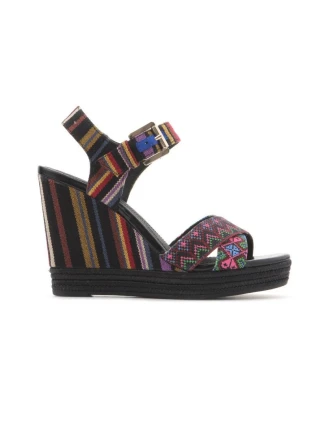 - Další zdobení zajišťuje zlatá přezka, která zároveň poskytuje možnost nastavení pásku u kotníku, a dvojitý černý copánkový povrch kolem podrážky.