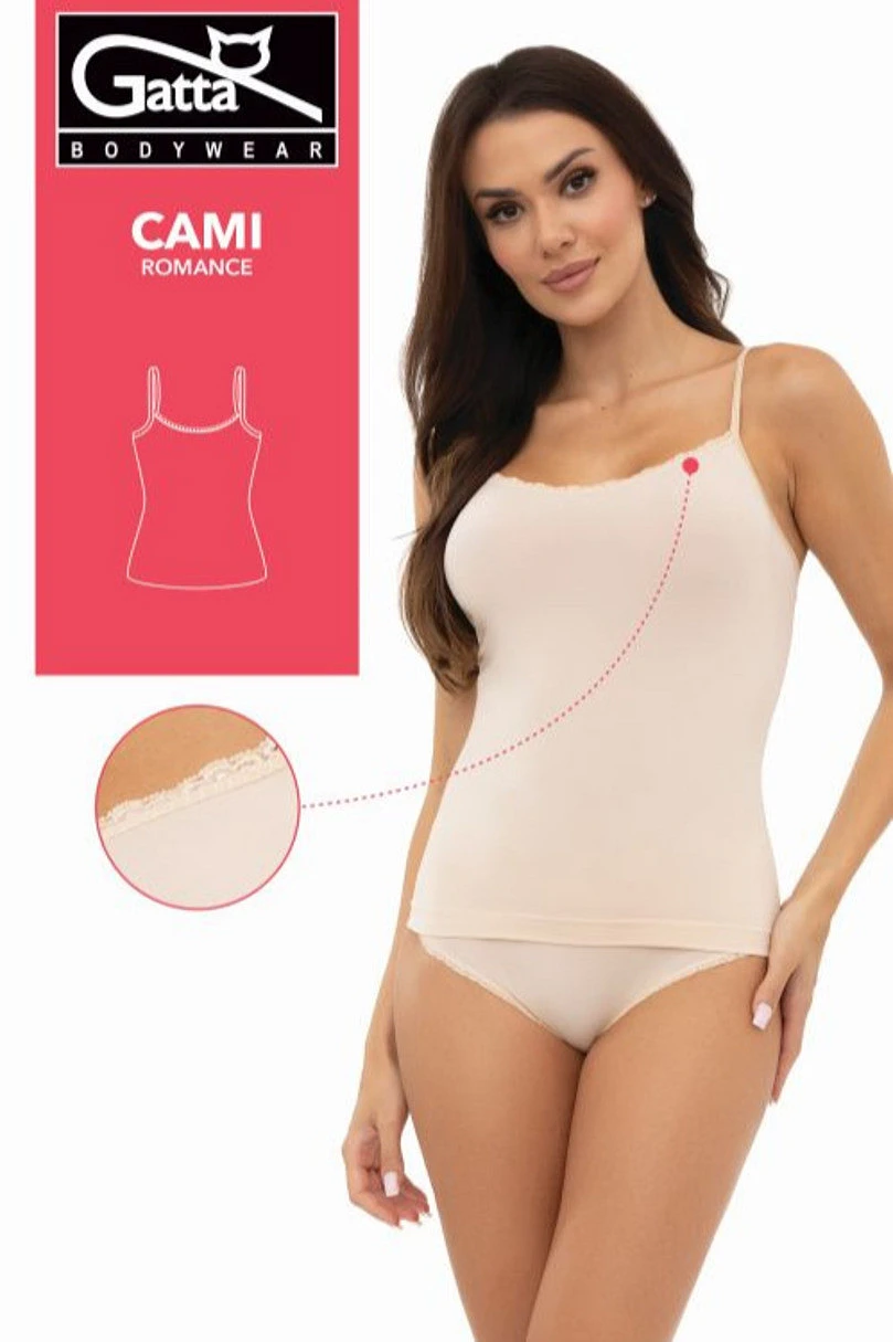 Gatta Bodywear Cami Romance to elegancka i wygodna koszulka damska na wąskich ramiączkach, stworzona z myślą o kobietach, które cenią komfort noszenia i subtelny, kobiecy styl. Gładki materiał doskonale dopasowuje się do sylwetki, zapewniając wygodę przez cały dzień. Delikatne wykończenie dodaje całości lekkości i romantycznego charakteru, dzięki czemu model Cami Romance świetnie sprawdzi się zarówno jako bielizna pod ubranie, jak i samodzielny element domowej garderoby. Koszulka została wykonana z wysokiej jakości poliamidu z dodatkiem elastanu, dzięki czemu jest miękka, elastyczna i przyjemna dla skóry. Wąskie ramiączka podkreślają subtelny wygląd modelu, a gładka struktura materiału sprawia, że koszulka dobrze układa się pod bluzką, swetrem czy marynarką. To idealny wybór dla kobiet poszukujących uniwersalnej koszulki basic o eleganckim wykończeniu. Gatta Cami Romance to połączenie funkcjonalności, estetyki i wygody. Doskonała na co dzień, do spania, po domu lu
