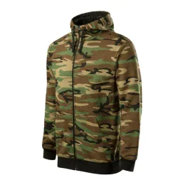 rovný střih s bočními švy celopropínací reverzní spirálový zip kapuce s podšívkou, na stažení šňůrkou vnitřní část průkrčníku začištěna páskou nakládané kapsy ve stylu klokanky dolní lem a manžety rukávů z žebrového úpletu 2:2 s 5 % elastanu kontrastní prvky vnitřní strana počesaná
