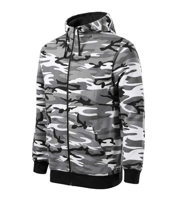 rovný střih s bočními švy celopropínací reverzní spirálový zip kapuce s podšívkou, na stažení šňůrkou vnitřní část průkrčníku začištěna páskou nakládané kapsy ve stylu klokanky dolní lem a manžety rukávů z žebrového úpletu 2:2 s 5 % elastanu kontrastní prvky vnitřní strana počesaná