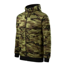 rovný střih s bočními švy celopropínací reverzní spirálový zip kapuce s podšívkou, na stažení šňůrkou vnitřní část průkrčníku začištěna páskou nakládané kapsy ve stylu klokanky dolní lem a manžety rukávů z žebrového úpletu 2:2 s 5 % elastanu kontrastní prvky vnitřní strana počesaná