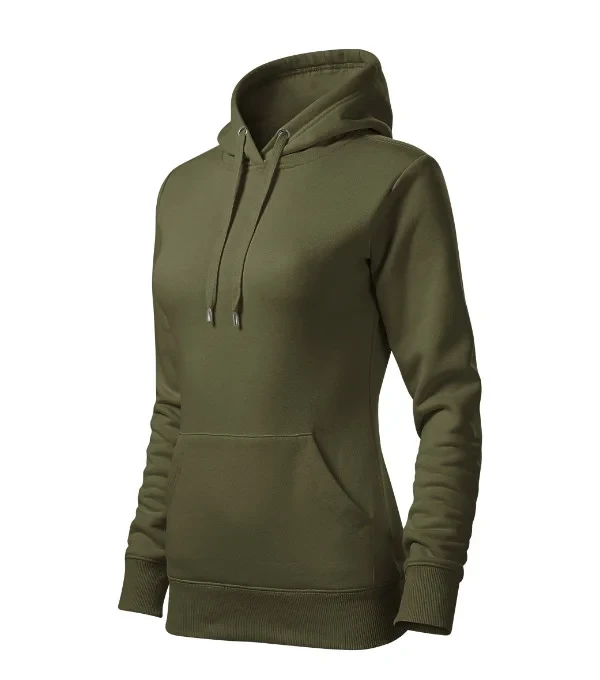 lehce vypasovaný střih s bočními švy kapuce s podšívkou, na stažení šňůrkou vnitřní část průkrčníku začištěna páskou v barvě vrchového materiálu nakládaná kapsa ve stylu klokanky dolní lem a manžety rukávů z žebrového úpletu 2:2 s 5 % elastanu vnitřní strana počesaná