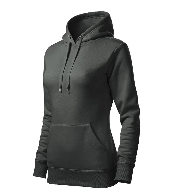 lehce vypasovaný střih s bočními švy kapuce s podšívkou, na stažení šňůrkou vnitřní část průkrčníku začištěna páskou v barvě vrchového materiálu nakládaná kapsa ve stylu klokanky dolní lem a manžety rukávů z žebrového úpletu 2:2 s 5 % elastanu vnitřní strana počesaná