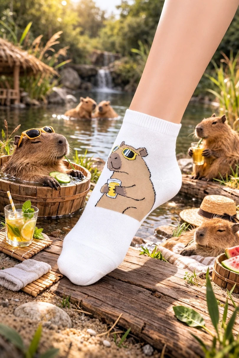 Model se vyznačuje módním vzorovaným motivem s kapybarou, který dodává stylizaci originální a hravý charakter. Ploché švy minimalizují riziko odřenin a podráždění, což z nich činí vynikající volbu pro každodenní nošení i aktivity.