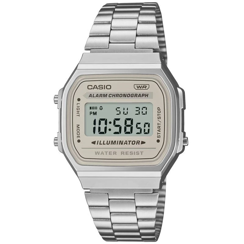 Ten zegarek to nie tylko odmierzacz czasu – to manifest stylu. CASIO w kolekcji Vintage wprowadza do współczesności klimat dawnych lat, kiedy design miał duszę, a prostota znaczyła klasę. Tarcza oprawiona w lekko połyskującą, chromowaną kopertę, budzi skojarzenia z industrialną elegancją – surową, ale szlachetną. Kwadratowy kształt i geometryczna czystość formy dodają mu charakteru – subtelnego, lecz wyrazistego. Dzięki kompaktowym wymiarom i lekkiej budowie (zaledwie 50 g), niemal stapia się z nadgarstkiem, dając poczucie naturalnego komfortu. Model posiadastandardowe wskazanie czasu (cyfrowe): godzina, minuta, sekunda, oznaczenie pory dnia (PM), data, dzień tygodnia. A gdy przychodzi moment działania – ma wszystko, czego trzeba. Stoper 1/100 sekundy, funkcja międzyczasów, codzienny alarm i sygnał godzinowy – praktyczne narzędzia w zgrabnym wydaniu. Wieczorem, gdy światło przygasa, wystarczy jedno naciśnięcie–elektroluminescencyjne podświetlenie w odcieniu nieb