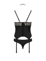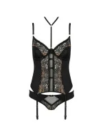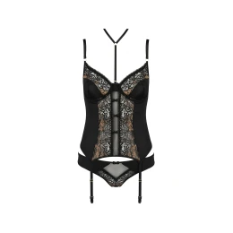 Korzet značky Casmir, model Divine corset. Výrobek je vyroben z 85% polyamidu, 8% elastanu, 7% polyesteru. Místo zapínání: na zádech. Dámský výrobek. Má drátky, které podpírají prsa a správně je tvarují. Bokové kalhotky. Korzet se zapíná na háčky. Výrobek má nastavitelná ramínka. Háčky na ramínka jsou kovové.