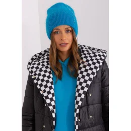 Teplá zimní čepice s pleteným vzorem. Zajímavá aplikace na přední straně.