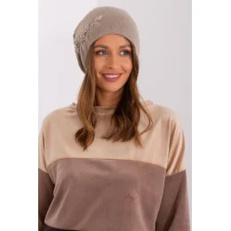 Hřejivá dámská zimní čepice z hladkého úpletu s ozdobnou aplikací na boku.