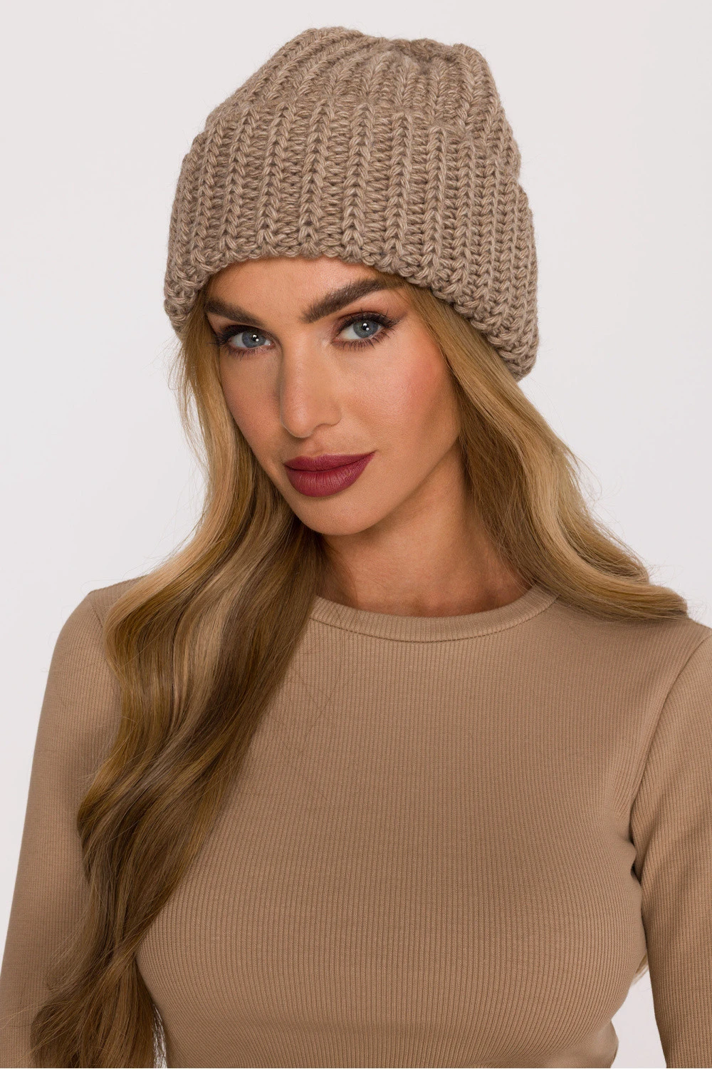Teplá čepice vyrobena z měkké příze s tlustým, pruhovaným vzorem. Má jednoduchý střih s trochou volnosti v horní části, co jí dodává volný, moderní vzhled. Ohrnutý lem zajistí lepší přiléhání a dodatečnou vrstvu tepla, vytvářející ideální kombinaci stylu a pohodlí.