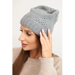 Dámská zimní čepice z vlny s ozdobným pletením a kamínky K449 šedá