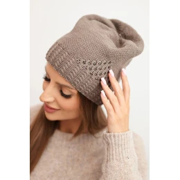 Dámská zimní čepice z vlny s ozdobným pletením a kamínky K449 mocca
