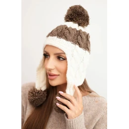 Dámská zimní čepice z vlny s bambulkami a ušnicemi K447 ecru + mocca