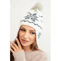 Dámská zimní čepice vlněná s motivem sněhové vločky a pomponem K450 ecru