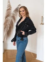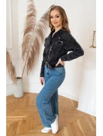Bunda má límeček, dvě kapsy a zapíná se knoflíky. Model je ozdobený lesklými kamínky a protrženími. V pase modelu je pásek pro zavazování. Bunda se směrem dolů zužuje a má délku do poloviny stehen.