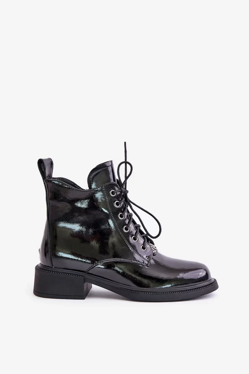 Lakované kotníkové boty vyrobené z přírodní kůže jsou elegantní a módní volbou pro chladnější dny. Zabudované na plochém podpatku, nabízejí pohodlí při nošení po celý den. Model má dvojité zapínání – šněrování a zip, což zajišťuje pohodlí a ideální přizpůsobení. Zaoblené špičky jim dodávají klasický charakter a vnitřek zateplený obuvnickou dekou zajišťuje teplo a pohodlí. Ideální na každý den, spojují eleganci s funkčností. Při výběru velikosti se prosím řiďte tabulkou velikostí.