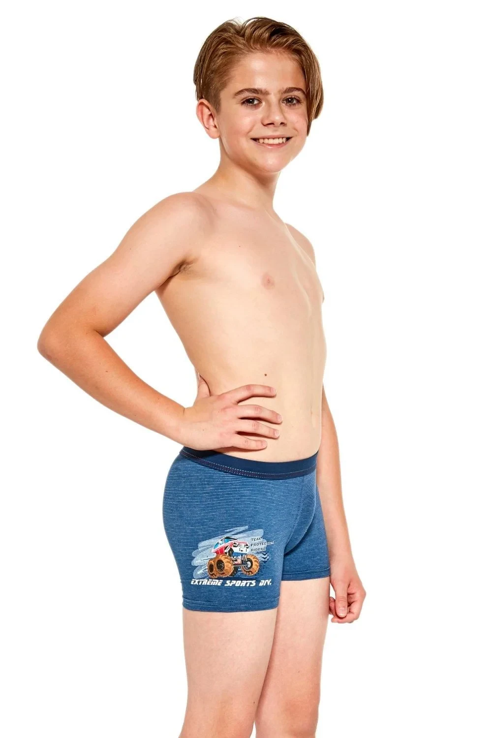 Chlapecké boxerky 700/116 Extreme CORNETTE - džínová barva - z vysoce jakostní bavlny - s potiskem - má gumu sešitou plochými švy - okraje nohaviček netlačí do stehen - jemně obepínají tělo