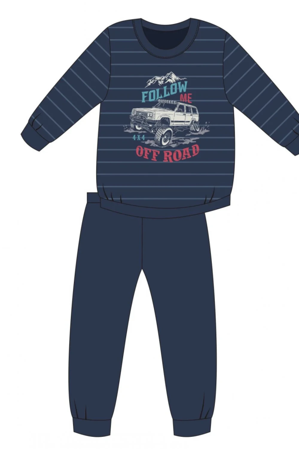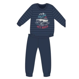 Chlapecké pyžamo 268/124 Young Follow me Cornette - vyrobené z vysoce kvalitní a měkké bavlny - tričko je tmavě modré barvy s dlouhými rukávy - zdobené barevným potiskem - dlouhé jednobarevné kalhoty mají pohodlnou gumu v pase
