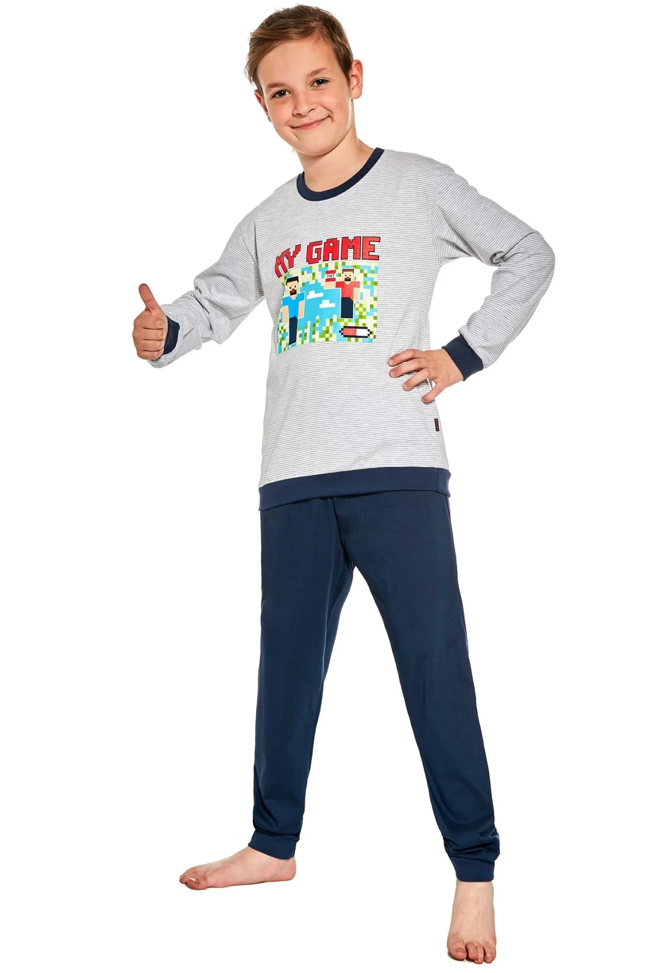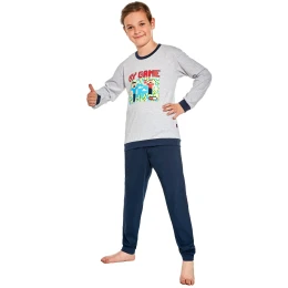 Chlapecké pyžamo 268/148 Game 2 CORNETTE - vyrobené z vysoce kvalitní a měkké bavlny - tričko je šedé barvy s dlouhými rukávy - zdobené barevným potiskem - dlouhé jednobarevné kalhoty mají pohodlnou gumu v pase