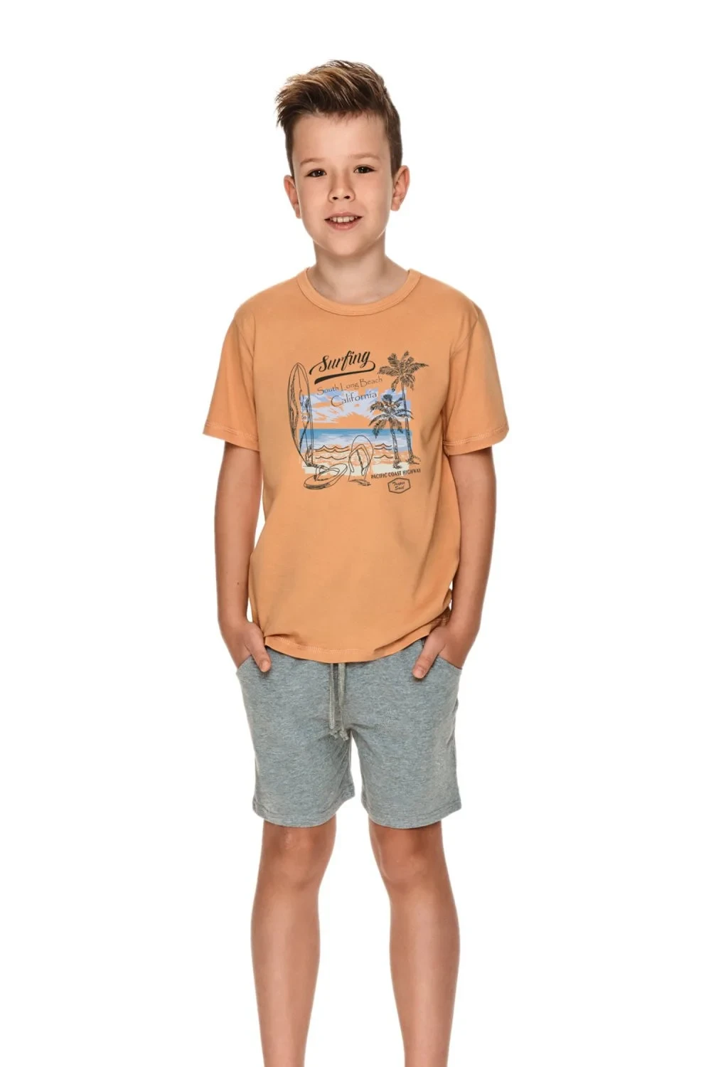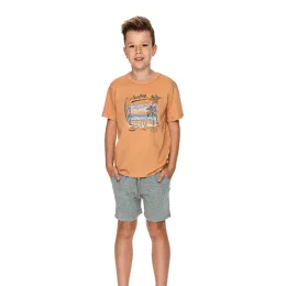 Chlapecké pyžamo 2749 Wadim TARO - vyrobené z vysoce kvalitní a měkké bavlny - tričko je skořicové barvy s krátkými rukávy - s barevným potiskem - šedé kraťasy - pohodlná guma v pase