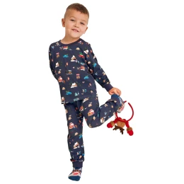 Chlapecké pyžamo 2838 Mikolaj Taro - vyrobené z vysoce kvalitní a měkké bavlny - tričko je tmavě modré barvy s dlouhými rukávy - zdobené barevným potiskem - dlouhé kalhoty s barevným potiskem - pohodlná guma v pase