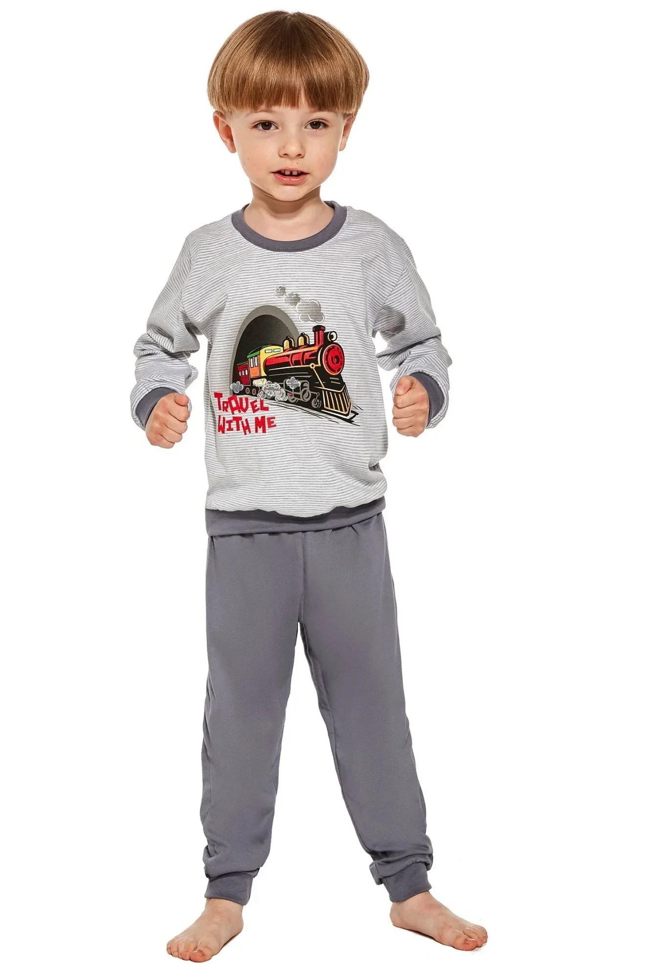 Chlapecké pyžamo 478/145 Train CORNETTE - vyrobené z vysoce kvalitní a měkké bavlny - tričko je šedé barvy s dlouhými rukávy - zdobené barevným potiskem a proužky - dlouhé kalhoty mají pohodlnou gumu v pase