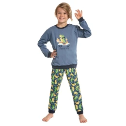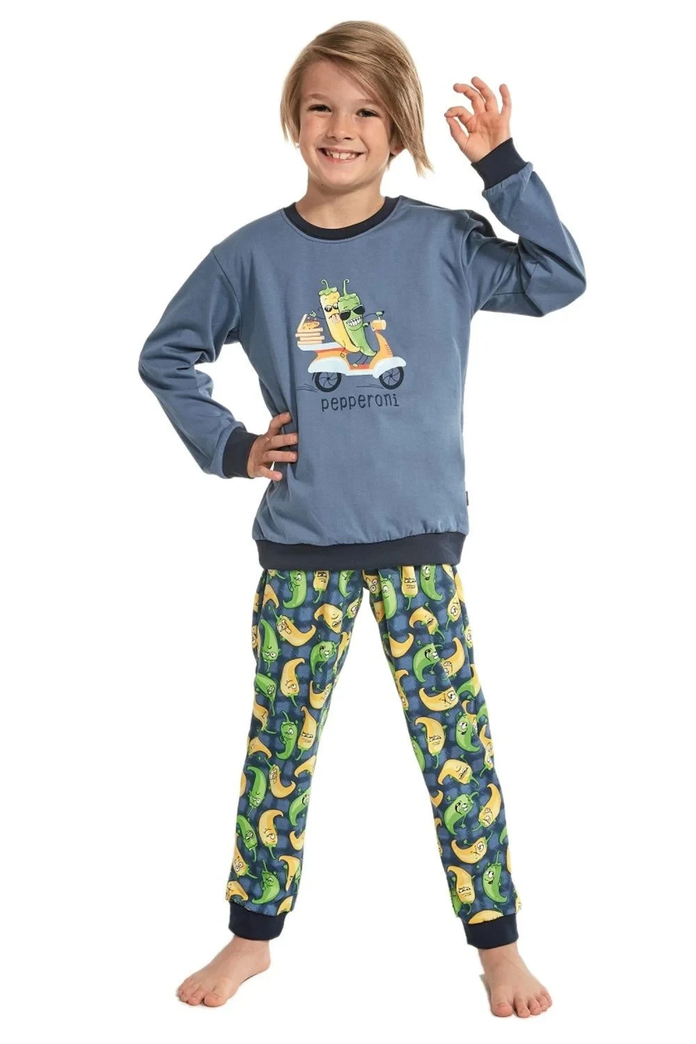 Chlapecké pyžamo 593/91 Pepperoni Cornette - vyrobené z vysoce kvalitní a měkké bavlny - tričko je modré barvy s dlouhými rukávy - zdobené barevným potiskem - dlouhé vzorované kalhoty mají pohodlnou gumu v pase