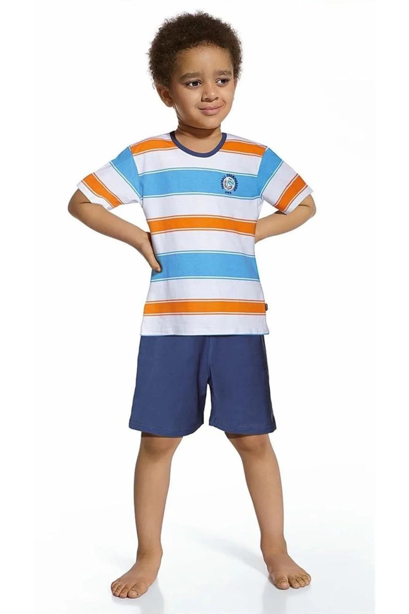 Chlapecké pyžamo 789/32 Championship Cornette - vyrobené z vysoce kvalitní a měkké bavlny - bílé tričko s krátkými rukávy - s barevnými pruhy - modré kraťasy - pohodlná guma v pase