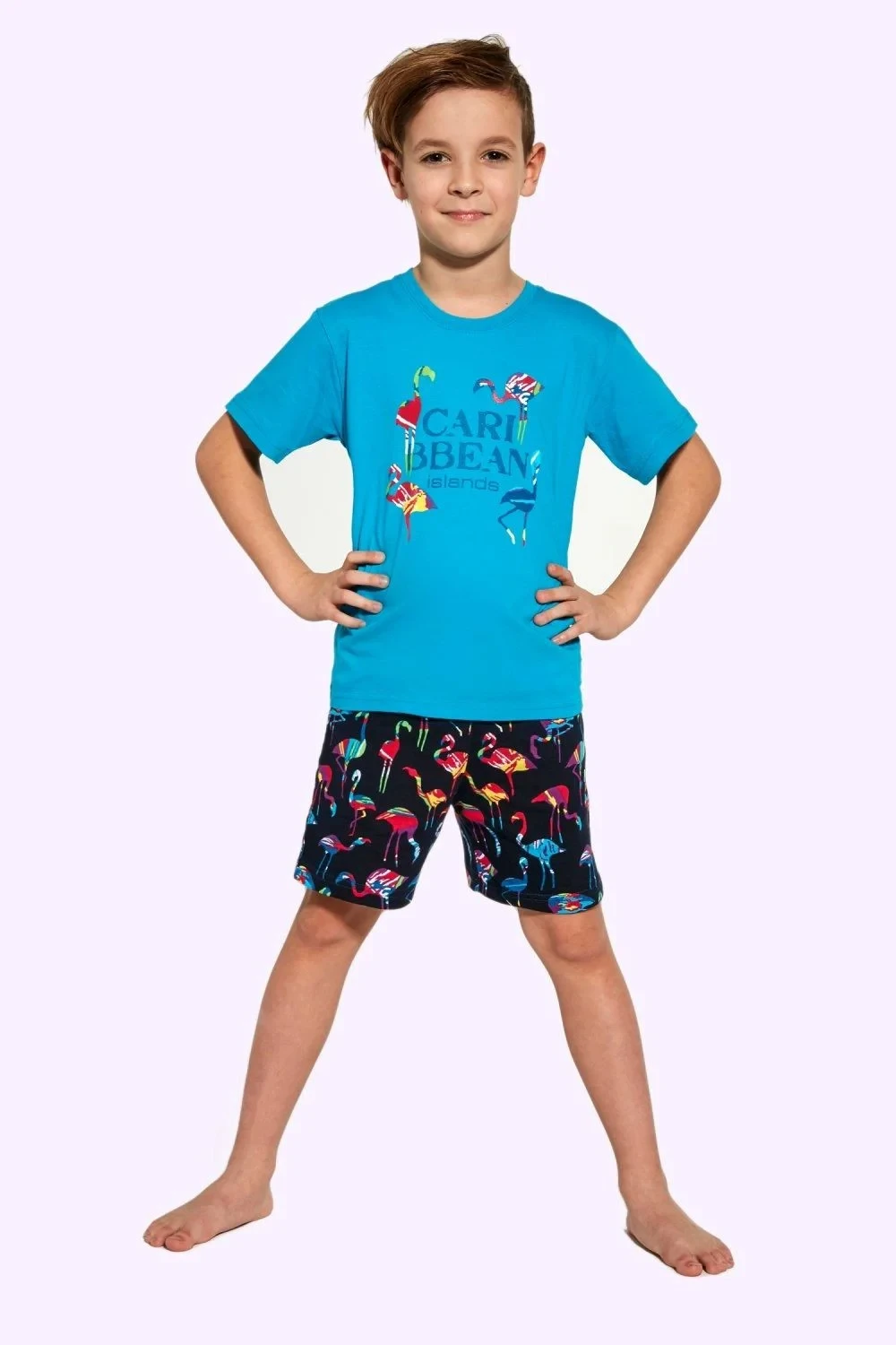 Chlapecké pyžamo 789/99 Carribean Cornette - vyrobené z vysoce kvalitní a měkké bavlny - tyrkysové tričko s krátkými rukávy - zdobené barevným potiskem na přední straně - vzorované kraťasy - pohodlná guma v pase