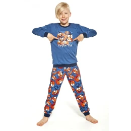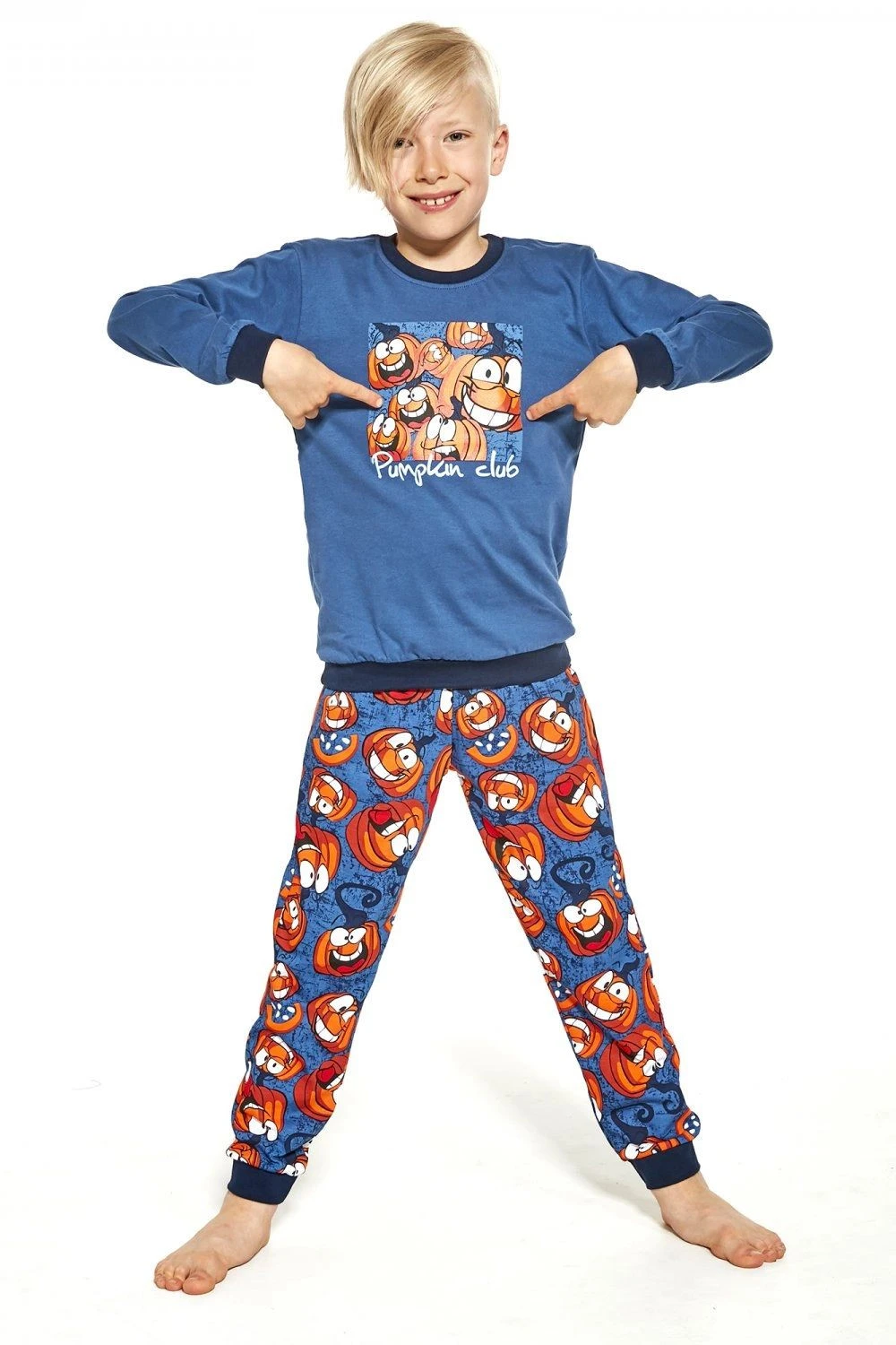 Chlapecké pyžamo 967/123 Pumpkin Cornette - vyrobené z vysoce kvalitní a měkké bavlny - tričko je modré barvy s dlouhými rukávy - zdobené barevným potiskem - dlouhé kalhoty mají pohodlnou gumu v pase