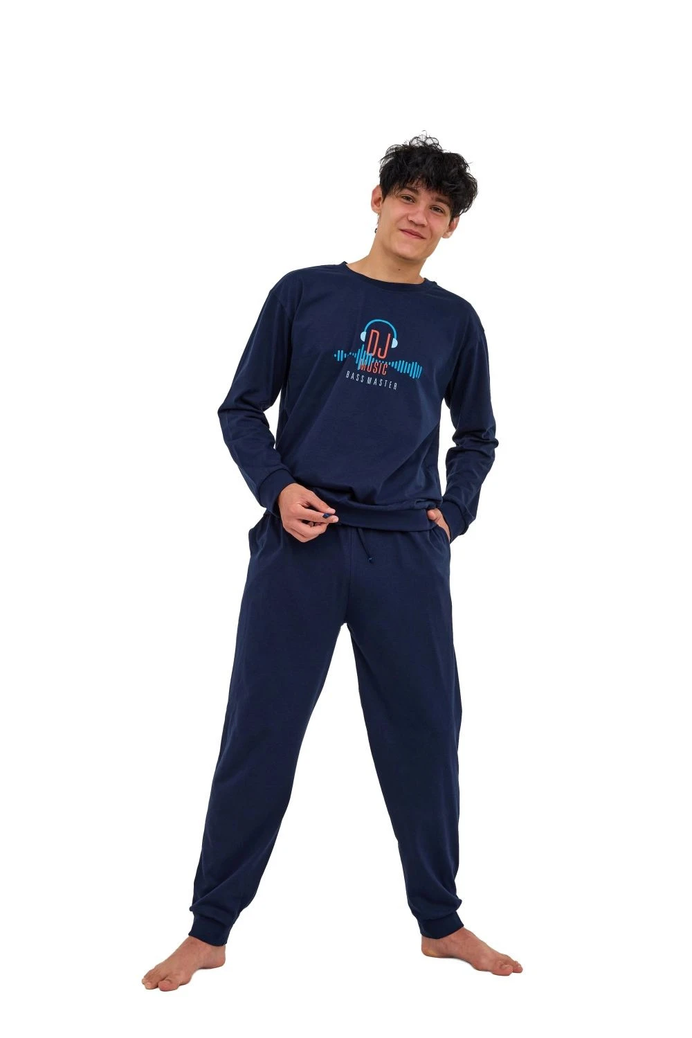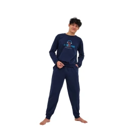 Chlapecké pyžamo 998/56 DJ CORNETTE - z vysoce jakostní bavlny - tričko je tmavě modré barvy s dlouhými rukávy - zdobené barevným potiskem - dlouhé jednobarevné kalhoty mají pohodlnou gumu v pase - na bocích kapsy