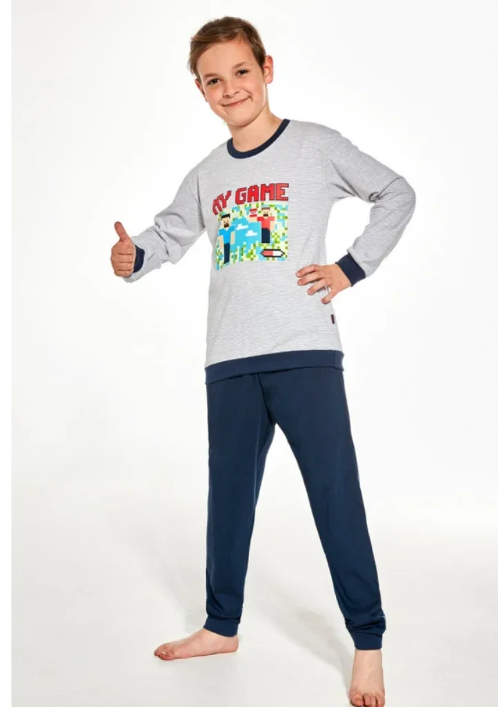 Chlapecké bavlněné pyžamo od značky Cornette. Pyžamo má tričko s dlouhým rukávem, na přední části je veselý potisk. Spodní díl je dlouhý a jednobarevný. V pase je měkká, široká guma. Rukávy i nohavice jsou ukončeny jemným úpletem