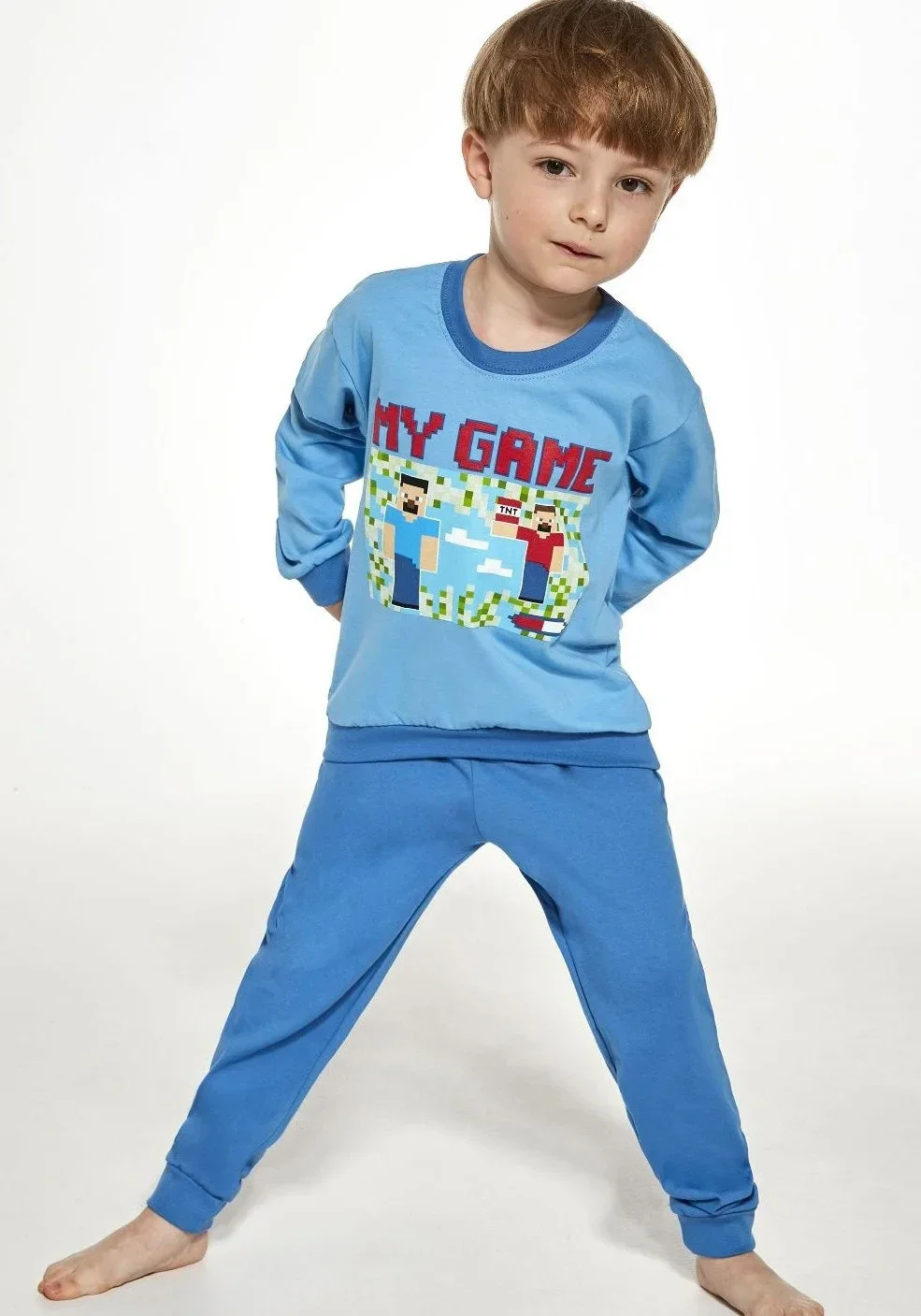 Chlapecké pyžamo značky Cornette. Pyžamo má tričko s dlouhým rukávem. Na přední části je veselý potisk. Spodní díl je dlouhý a jednobarevný. V pase je měkká, široká guma.