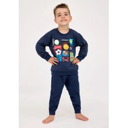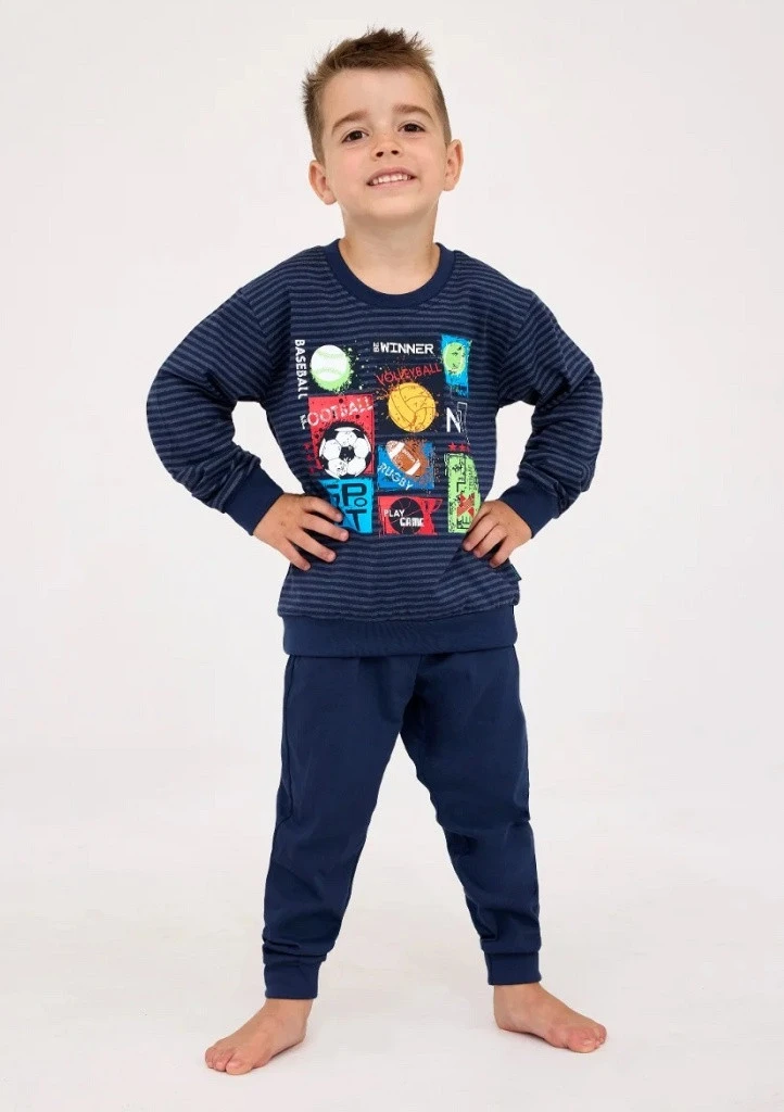 Stylové a pohodlné dvoudílné pyžamo značky Cornette. Skládá se z dlouhého rukávu a dlouhých kalhot. Horní díl s proužkovým vzorem a sportovním potiskem, spodní díl jednobarevný. Spodní díl má pružný pas pro pohodlné nošení. Rukávy, dolní lem a nohavice jsou zakončeny manžetami, které drží tvar a už nepovolují. Přední díl trička je zdoben decentním potiskem s tématikou. Kombinace bavlny a polyesteru zajišťují pohodlí a výdrž. Vhodné pro chlapce se sportovním duchem díky motivu míčů. Kalhoty mají elastický pas a lemované ukončení.