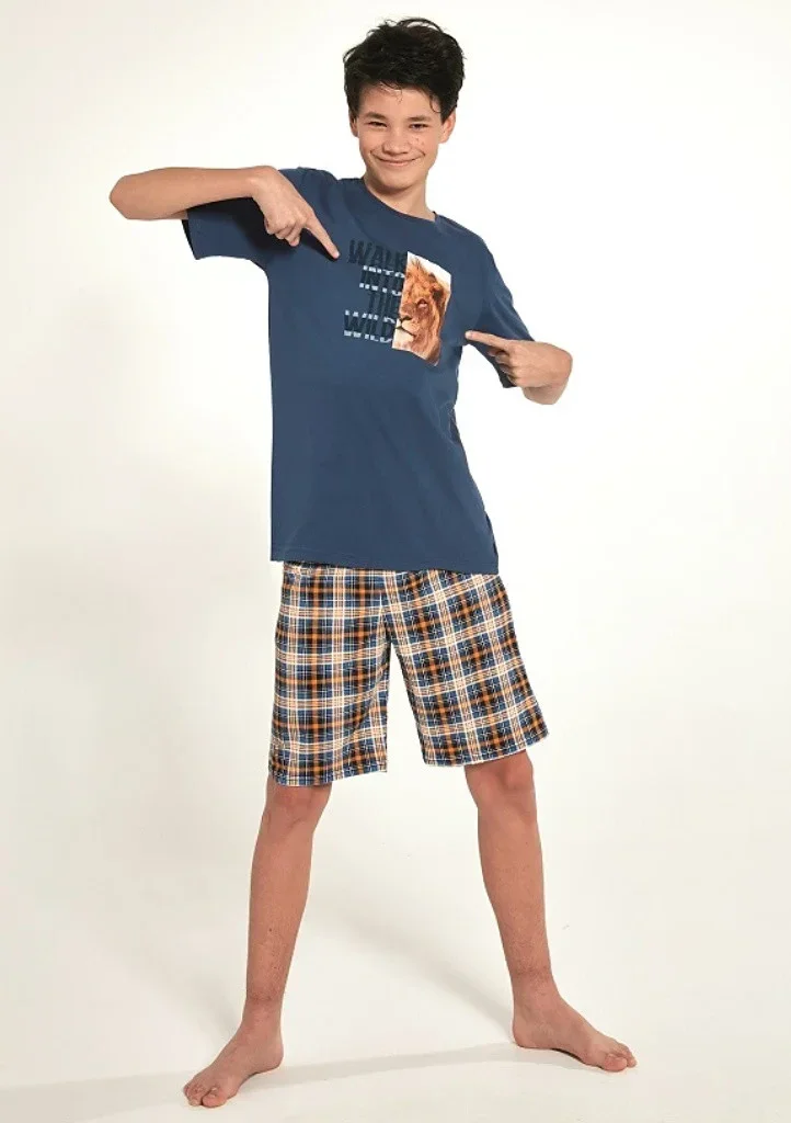 Chlapecké pyžamo značky Cornette. Pyžamo se skláda z trička a kraťasů. Tričko má krátký rukáv a kulatý výstřih. Na přední části je natištěná aplikace lva. Kraťasy mají pružnou a pohodlnou gumu. Kraťasy mají po celé ploše kárový potisk.