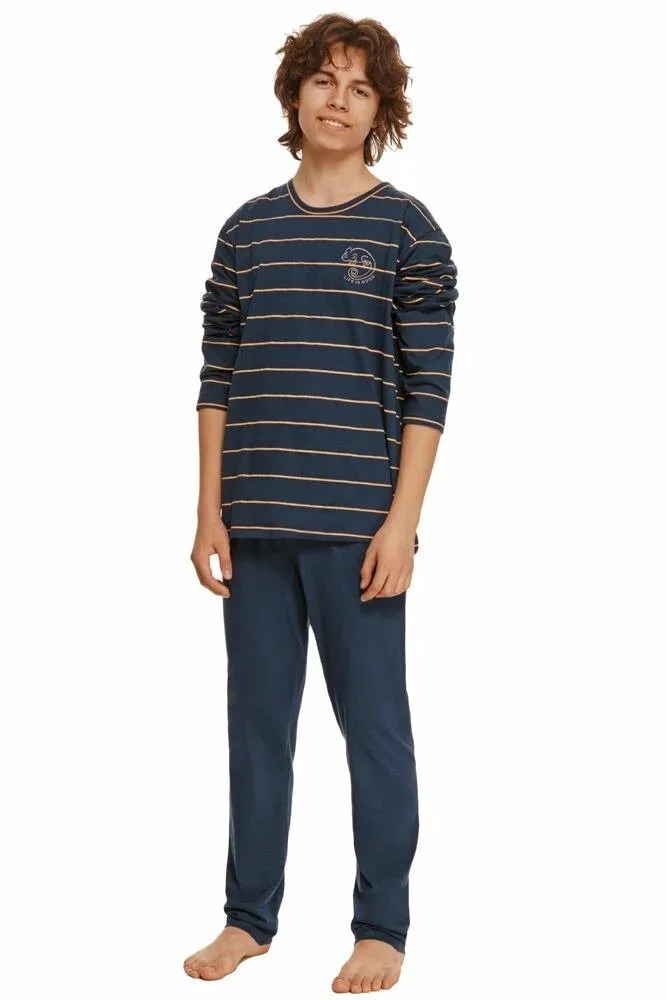 Bavlněné chlapecké pyžamo je tmavě modré, proužkované a má potisk malého chameleona.