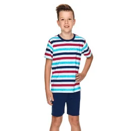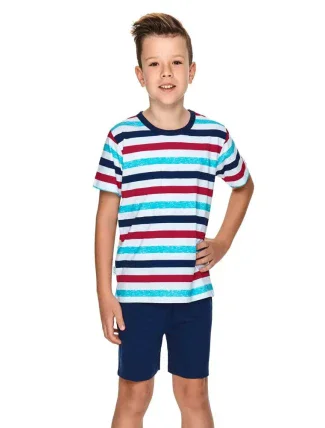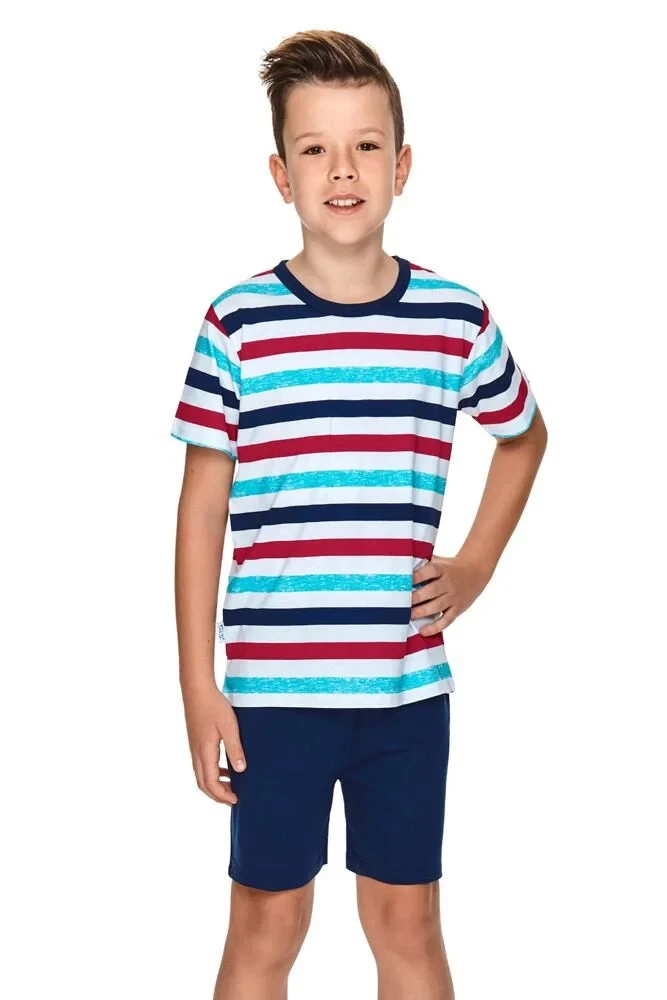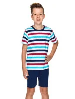 Bavlněné chlapecké pyžamo je tmavě modré, proužkované a má potisk malého chameleona.