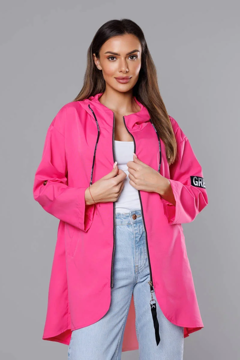 Přehoz se zapíná zipem a má dvě kapsy bez zapínání. Vzadu je v pase guma. Rukávy je možné ohrnout. Přední část modelu má délku k bokům a zadní část má délku do poloviny stehen.