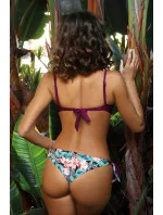 Propozycja dla pań, które marzą o dużych, jędrnych, seksownych piersiach, pięknie zebranych w dekolcie. Biustonosz wyróżnia się wspaniałą konstrukcją, przewidzianą na mniejsze i średnie piersi - jest usztywniany i posiada dość duże wypełnienie push up, umieszczone na stałe w biustonoszu. Umożliwia spektakularne wypchnięcie piersi ku górze, ich wymodelowanie i optyczne powiększenie, co zresztą widać na zdjęciu. Zastosowanie kwiecistej, delikatnej lamówki u góry, dodatkowo zwraca uwagę na pięknie wymodelowany dekolt. Ramiączka o regulowanej długości, odpinane, idealne sprawdzą się podczas opalania. Obwód wiązany na plecach. Figi to wzorzyste, wiązane po bokach brazyliany. Dla uzyskania pełnego efektu należy je mocno pociągnąć ku górze, aby ich trójkątny kształt ładnie ozdobił pupę, która częściowo wysuwa się poza kontur fig.