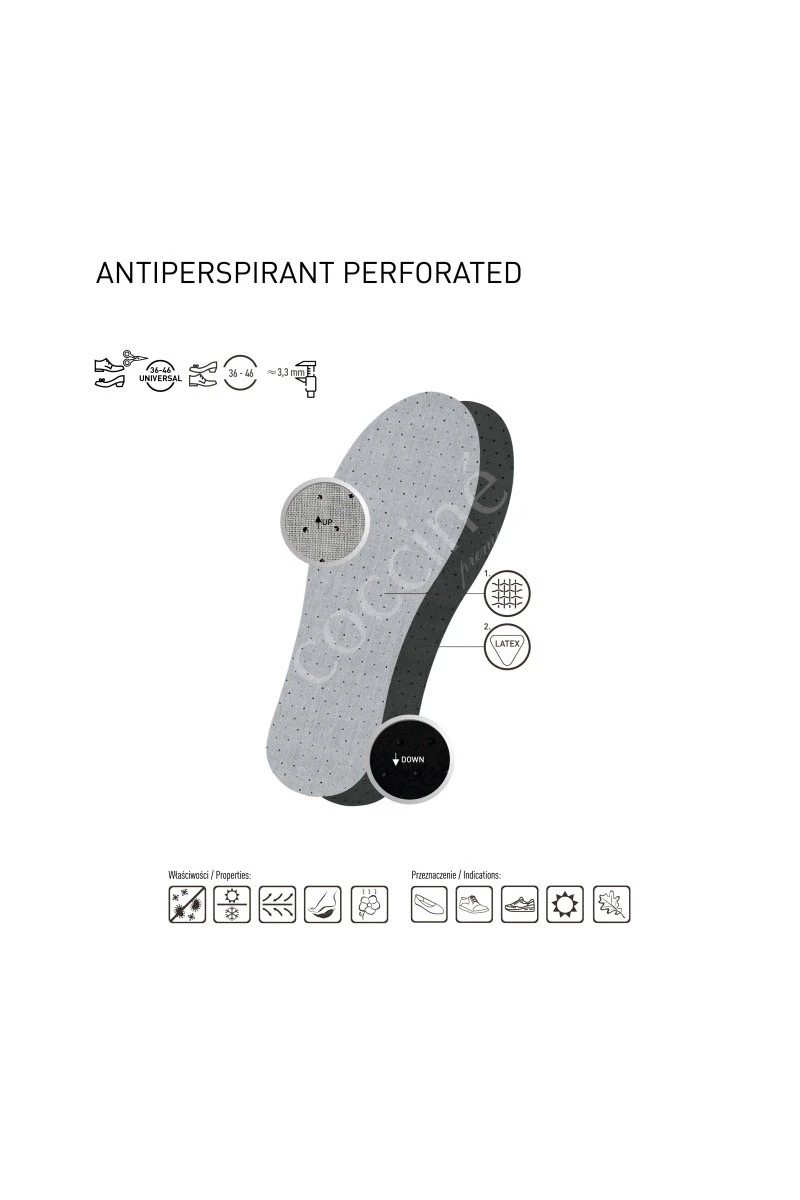 Anti-foaming inserts made of perforated over the whole surface latex foam, containing a fiber with active carbon. Perforation improves the air circulation in the shoe. The carbon fiber absorbs unpleasant odors , and also binds biologically active microorganisms, providing freshness . Covered with a thin, cotton fabric, delicate and soft, the insole is recommended for a significant load on the feet, e.g. overweight, standing or walking on hard ground. The active caliber is a great absorbent of many chemical compounds. Non-toxic substance used in medicine and industry. P>