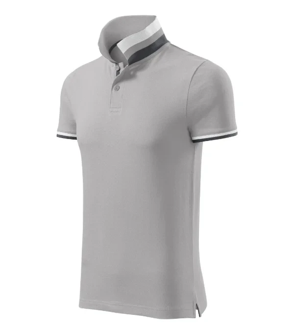 střih s bočními švy límeček a lemy rukávů z žebrového úpletu 1:1 spodní část límečku a lemy rukávů s kontrastními pruhy léga s 2 knoflíčky v barvě materiálu rozparky v bočních švech a spodní léga s kontrastní páskou vnitřní průkrčník začištěn kontrastní páskou zpevnění ramenních švů páskou