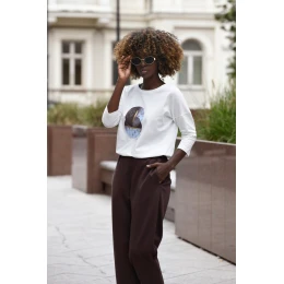 Kolika – bluzka damska z nadrukiem i rękawem 3/4 to idealne połączenie elegancji i komfortu. Wyróżnia się subtelnym, złotym nadrukiem na przodzie, który nadaje jej unikalnego charakteru. Dzięki prostemu fasonowi z klasycznym wykończeniem dołu, świetnie dopasowuje się do różnych typów sylwetek i stylizacji. Wysokiej jakości dzianina z bawełną i elastanem gwarantuje wygodę noszenia przez cały dzień – w pracy, na spotkaniu czy spacerze.